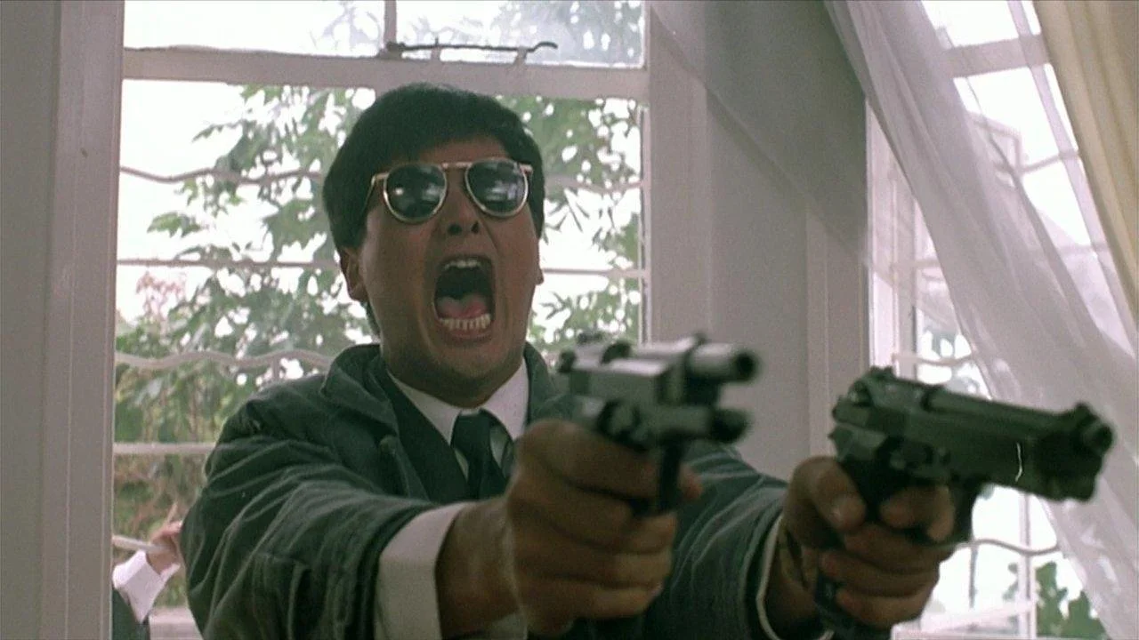 How did Woo and Hark bring Mark back from death-by-hundreds-of-bullets? They didn’t. Instead, they introduced his heretofore unmentioned twin brother Ken (Chow), an amiable, easygoing, sometimes downright goofy chef living and working in New York after leaving his life of violence behind. Despite trading his guns for a wok and trying to keep the local youths from idolizing Mark, Ken is not a man to be crossed. When the wicked insist on violence, Ken answers their demands tenfold. His blasting his way out of an ambush while bodyguarding traumatized-but-slowly-coming-back-to-himself new protagonist Lung Sei (Dean Shek) stands as one of Woo’s great action scenes, even though it shares a film with II’s astounding climax.