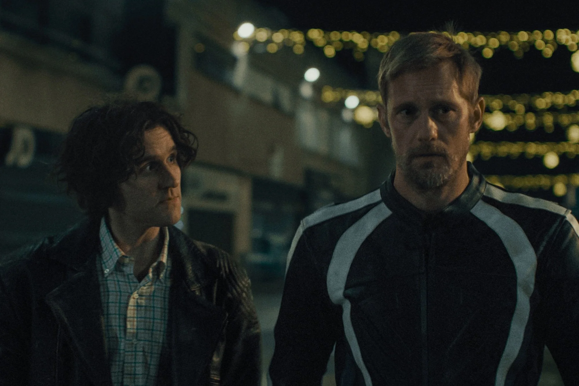 The first moments of Harry Lighton’s feature debut, Pillion, keep the audience in the dark: before an image fills the screen, we hear the revving of a powerful engine. The rumble transitions into Betty Curtis’s Italian version of “Chariot” as a motorcycle helmet appears, a car’s taillights reflected in the visor. The song’s promise, “Se verrai con me/sul mio carro tra le nuvole… Tu vivrai con me/in un'isola fantastica,” (translation: If you come with me on my chariot in the clouds… you will live with me in a fantasy island), acts as an epigraph for the central tension of the film: idealistic fantasies that are less than achievable in practice. The motorcyclist passes the car, which holds Colin (Harry Melling), a backseat passenger in the vehicle and in his own life, already a pillion before he ever touches a bike. This is the first time that Colin has laid eyes on the driver, Ray (Alexander Skarsgård), but it will hardly be the last.